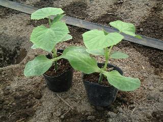 本葉2.5枚になったところで、キュウリ苗を定植します。