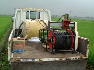 エンジン式動噴と薬液タンクを1.5トントラックに載せて、田んぼをひとつひとつ廻ります。 この動噴はホースの自動巻き取り装置を装備しており、レバーをたおすと、自動でホースをきれいに巻き取ってくれます。 |